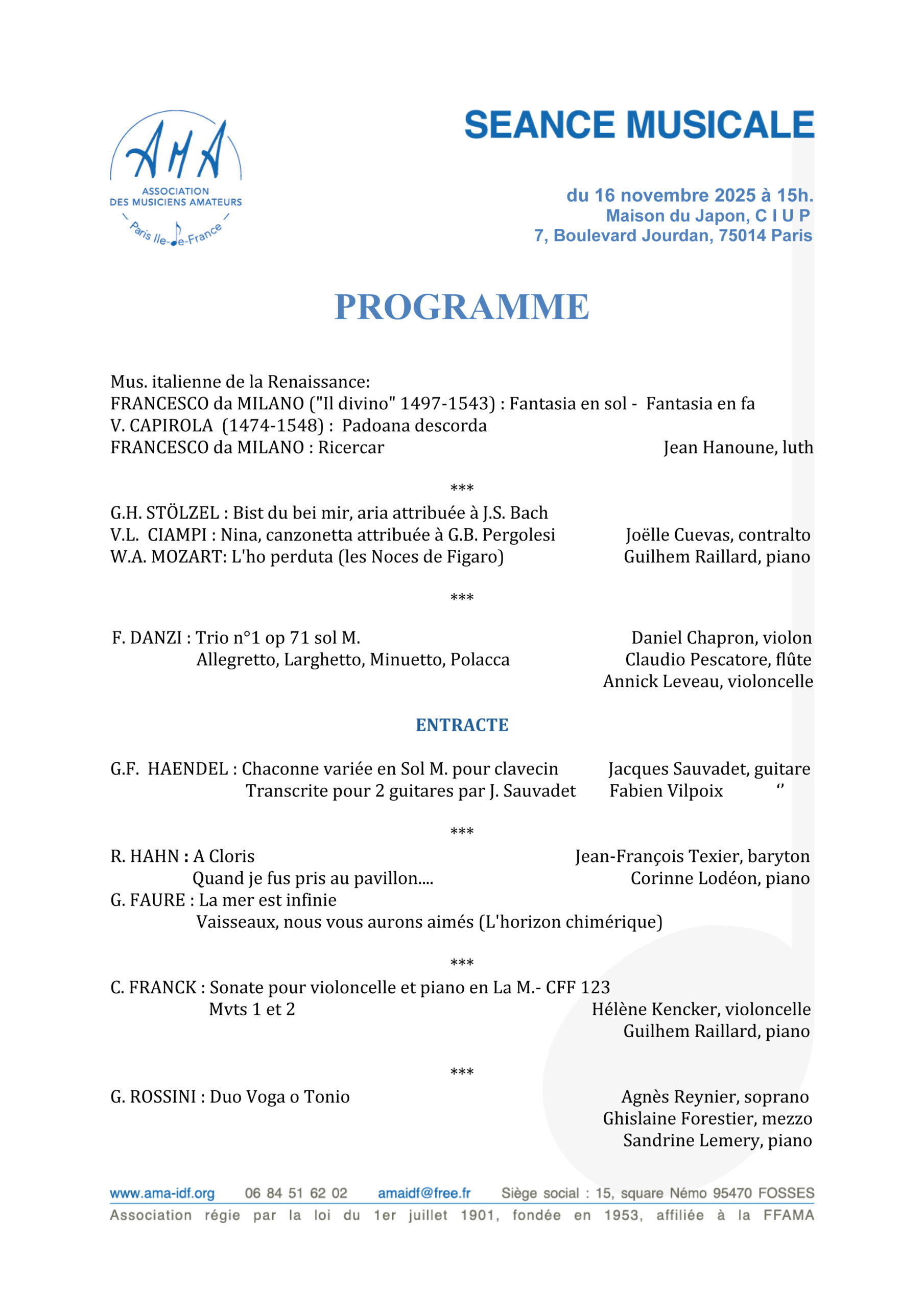 Nous organisons huit séances par an et communiquons les dates dès que possible. Le public est constitué de nos adhérents et leurs invités. Vous n’êtes pas encore adhérent et désirez nous écouter, contactez-nous sur amaidf@free.fr.